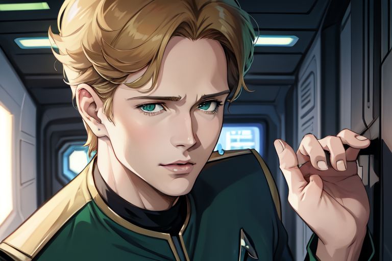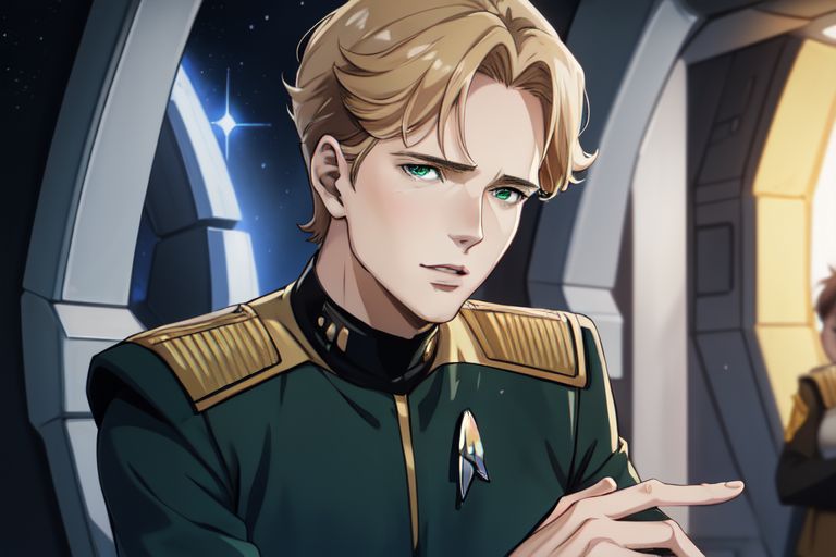 | Physical Description | Good-looking to the point of almost being called pretty, he has a mop of curly blonde hair atop a set of piercing green eyes that seem to stare into the very heart of a person. He is almost always seen with a smirk of some kind on his face. He tends to favor the optional green commanding officer tunic over the more traditional gold uniform. |